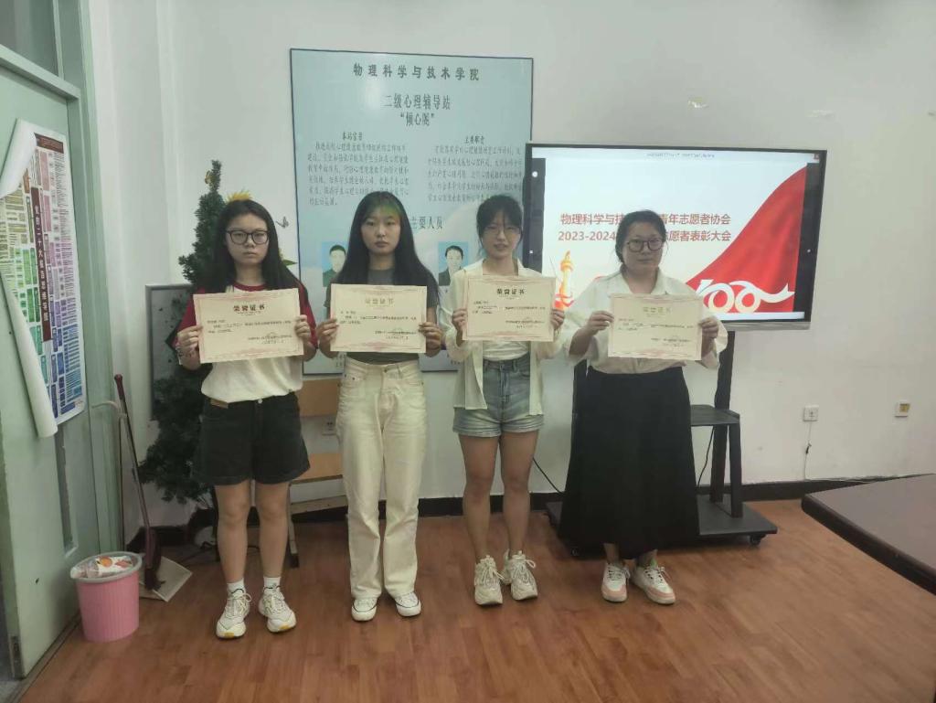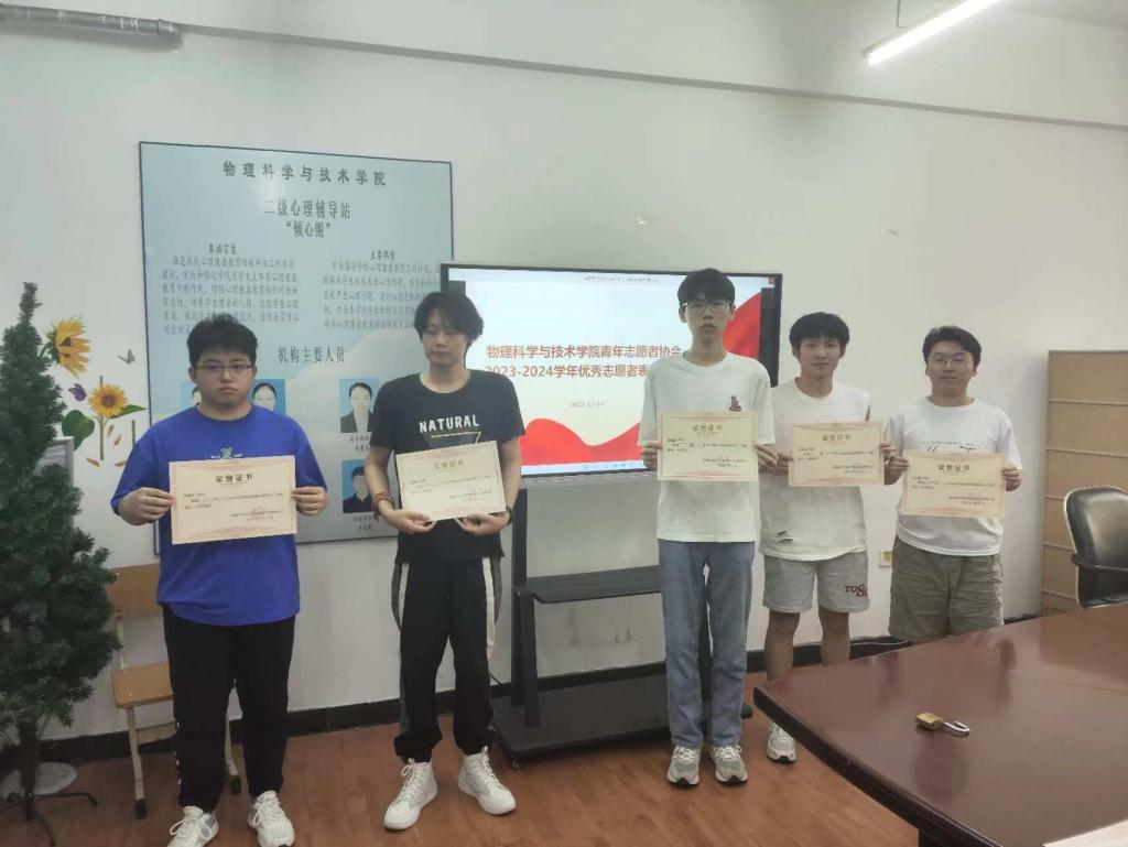 为总结本学期学院青年志愿者工作情况,加强组织建设,推进工作发展,对优秀志愿者进行表彰,物理科学与技术学院青年志愿者协会于2024年7月5日13:30,在实验楼210-1室召开了期末总结暨优秀志愿者表彰大会。会议由青年志愿者协会主席杨晨冰主持。