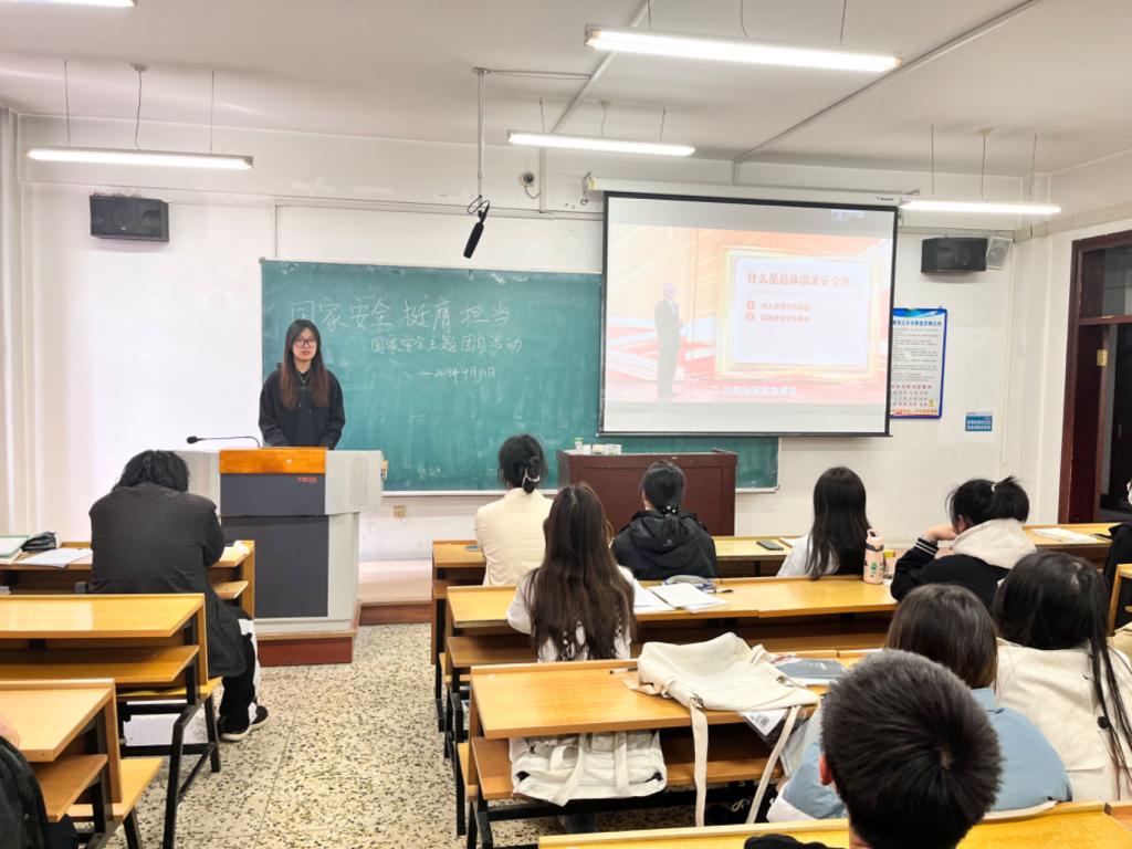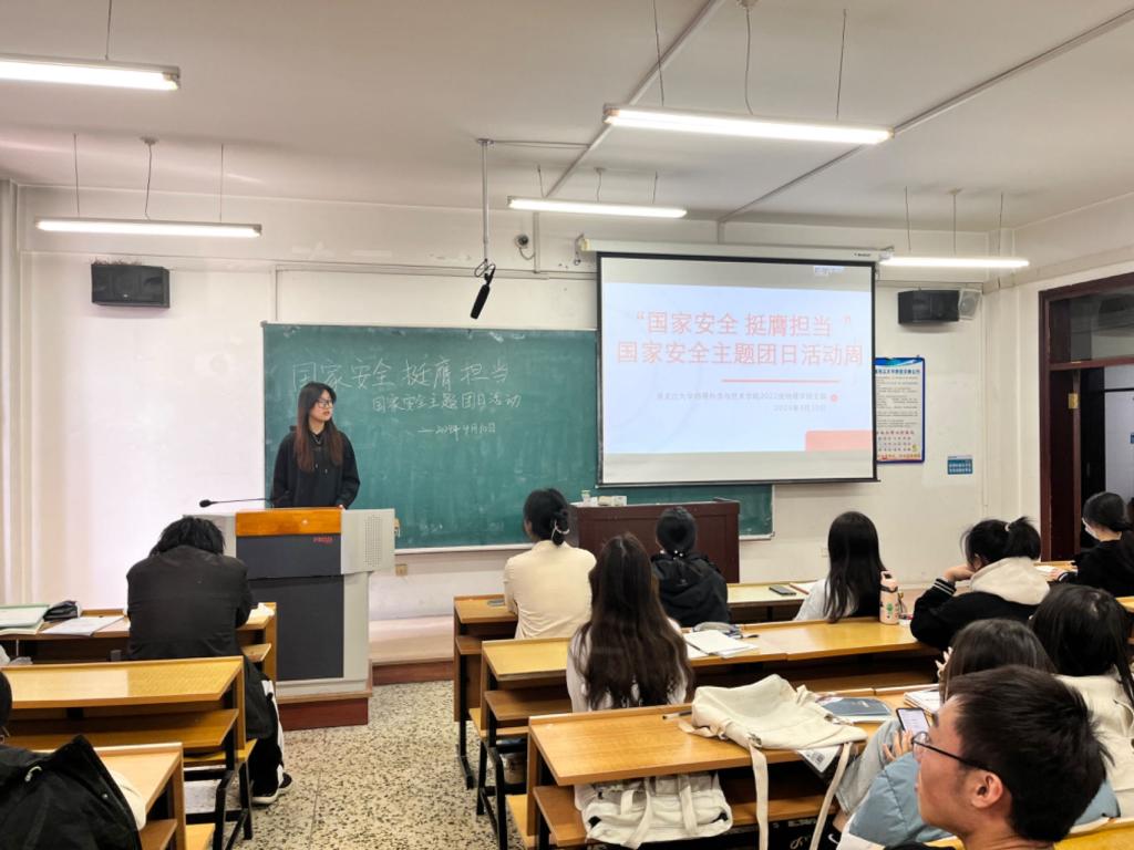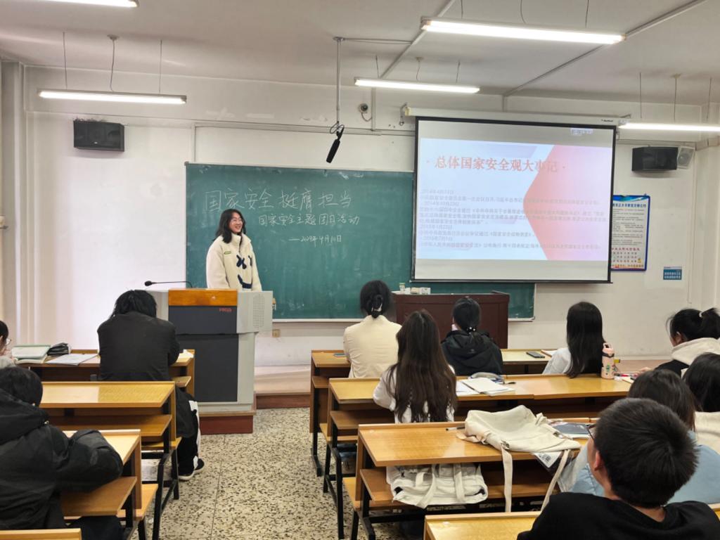 为全面贯彻党的二十大和二十届二中全会精神,引导团员青年深入学习贯彻总体国家安全观,动员团员青年坚定不移走中国特色国家安全道路,物理科学与技术学院于4月10日上午9:00,在汇文楼407举办“国家安全 挺膺担当”国家安全主题团日活动,2022级全体同学参会,2022级物理学1班团支书何宝丽彤主持。