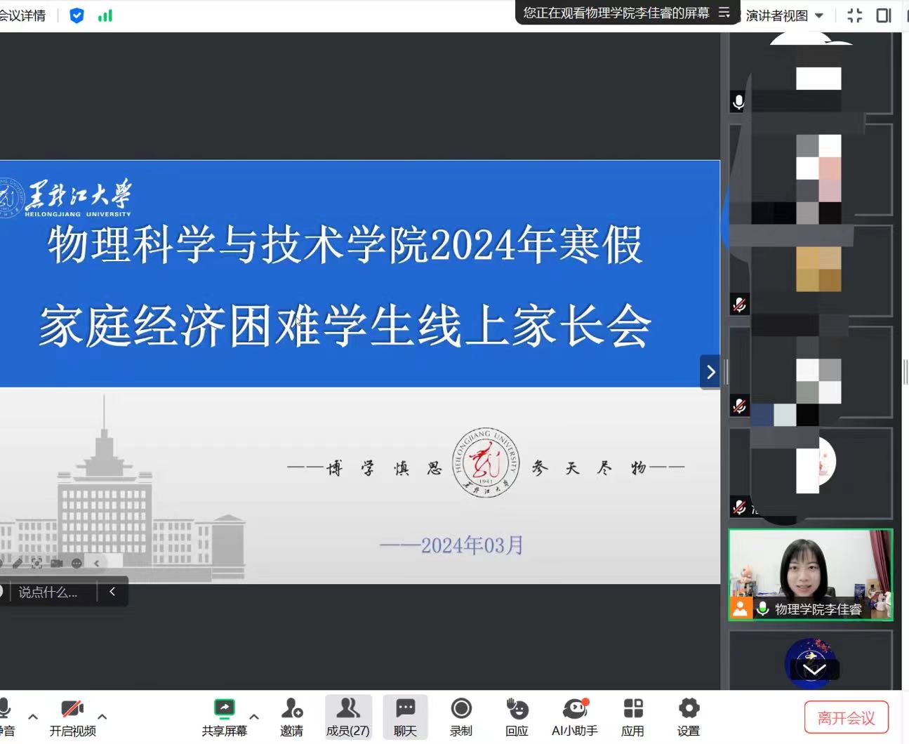 为全面贯彻落实习近平总书记关于教育工作的战略部署,进一步落实立德树人根本任务,加强家校有效沟通,提升资助育人成效,高质量推进学校精准资助工作。2024年2月-3月,物理科学与技术学院各年级召开家庭经济困难学生家长会,会议由各年级辅导员主持,学院家庭经济困难学生及家长参加会议。