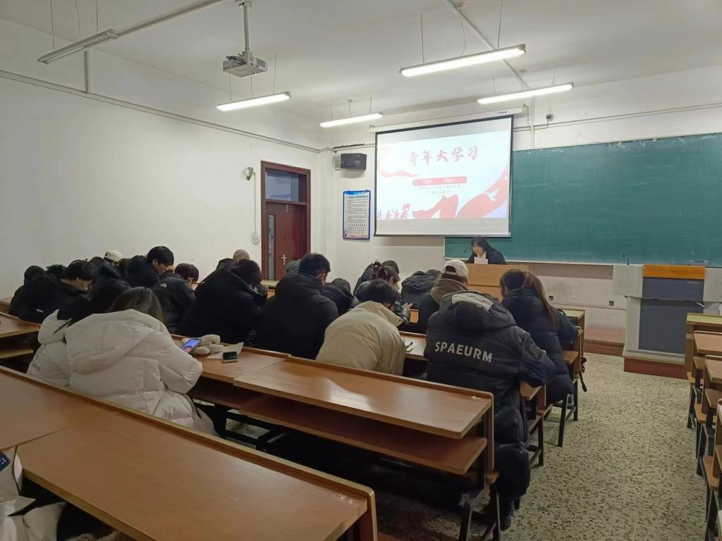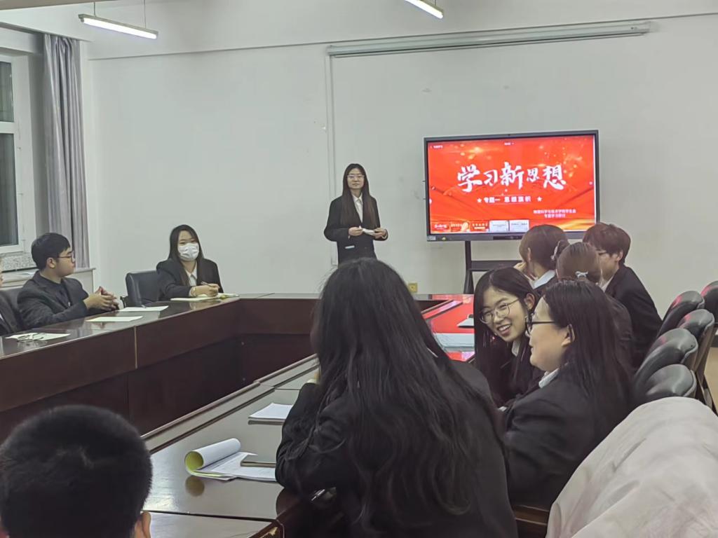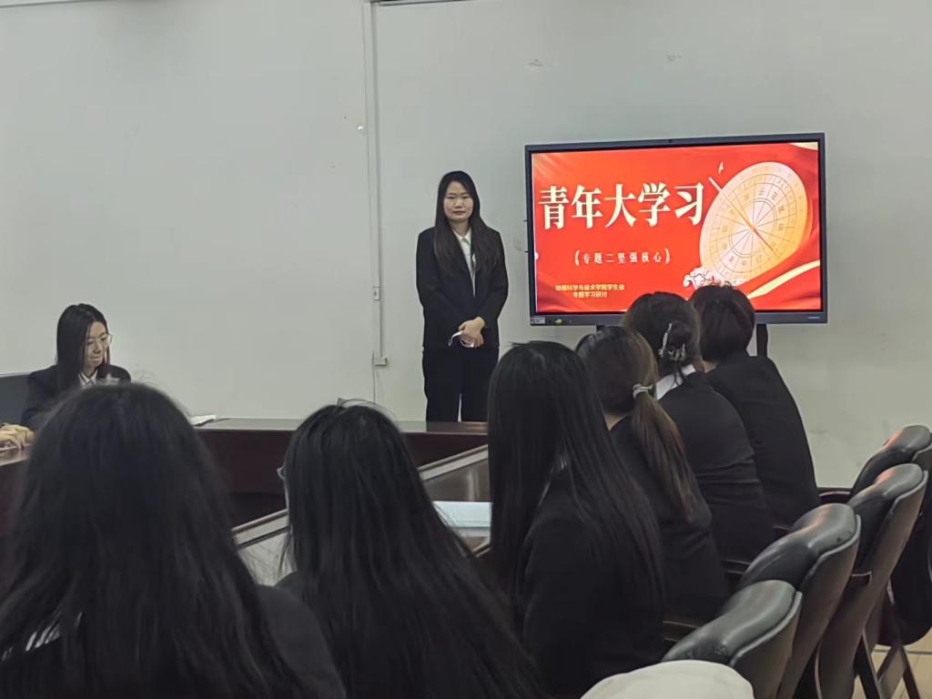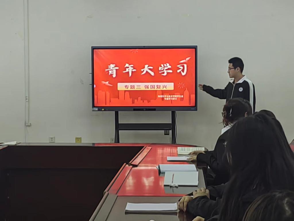 根据学校对团员和青年加强理论学习的工作要求,2023年12月物理科学与技术学院分别以“思想旗帜”“坚强核心”“强国复兴”“挺膺担当”为主题开展专题学习会,学习会由学生会主席刘雨晴主持,学生会全体成员参会。