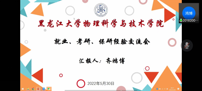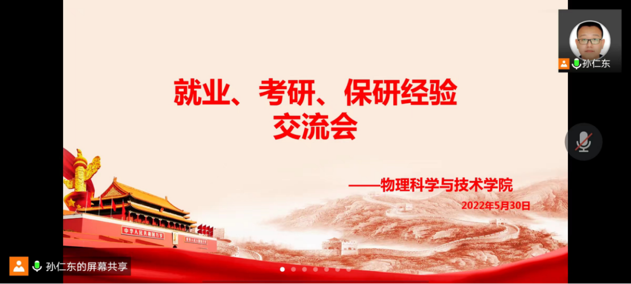 为延续我院优良学风,发挥优秀学生的带头示范作用,给低年级同学提供保研、考研、就业方面相关经验。物理科学与技术学院于2022年5月30日晚8:10举办线上保研考研就业经验交流会。本次交流会诚挚邀请2018级保研、考研、就业成功的学长学姐,旨在向低年级同学分享自己的经验并为同学们答疑解惑。