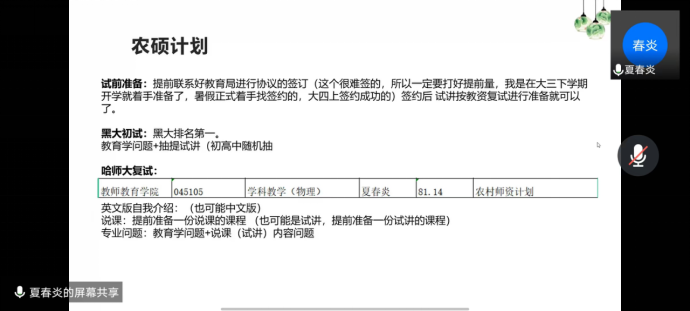 会议伊始,由学生会学习部部长孙仁东同学介绍本次交流会的意义,希望同学们把握本次机会,丰富自己的见识,利用高年级学长学姐的经验来提前了解关于保研就业的相关需求。首先由夏春炎学长与陈佳欣学姐分别为同学们讲解了农硕计划、夏令营、预推免等保研方面的相关事项。齐鸿博学长与樊光琦学长分享了自己在考研期间的经验,希望同学们“好好学英语、多刷专业课”。最后由路丽娜学姐与井艺萌学姐分享自己的就业经验,在就业方面需要提高自己的简历质量,增强自身素质,方可在面试时突破重围、一跃成名。