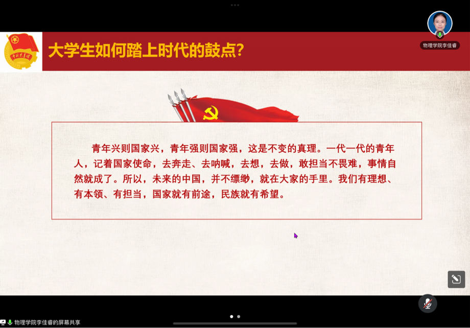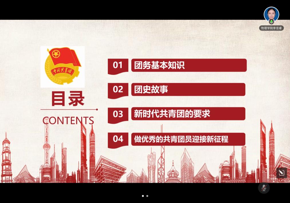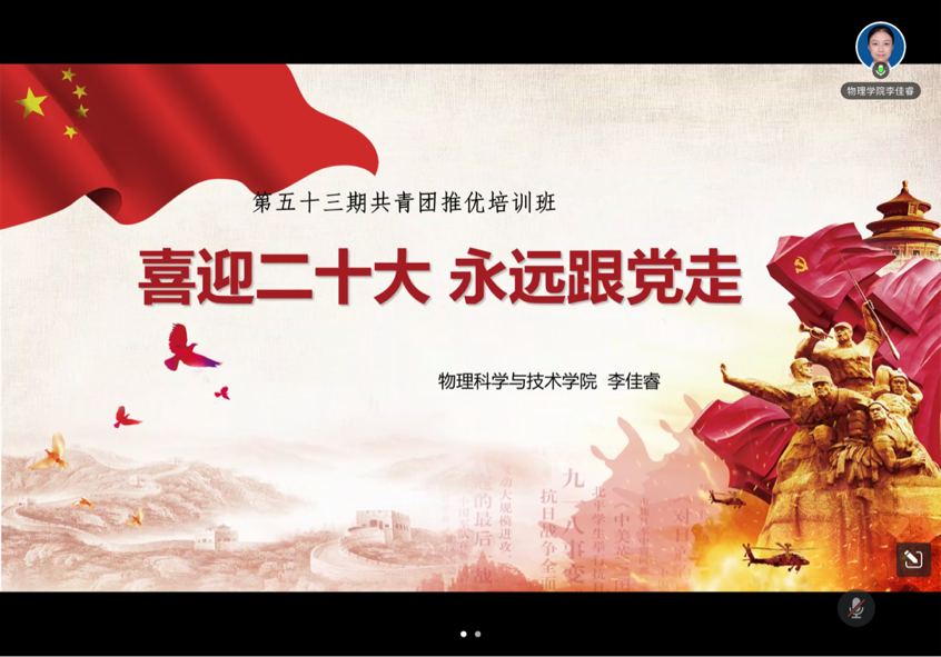 今年是党的二十大召开之年,为深入学习贯彻习近平新时代中国特色社会主义思想和党的十九届历次全会精神,喜迎建团100周年。按照校团委《关于举办黑龙江大学第五十三期共青团“推优”培训班的通知》要求,物理科学与技术学院于2022年4月11日在腾讯会议举办了第53期共青团推优培训班。物理学院辅导员李佳睿老师作为主讲人,第五十三期推优培训成员全员参加此次培训。