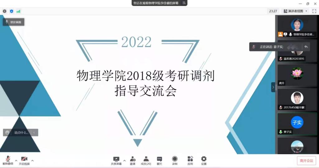 为帮助我院考研同学更全面的了解调剂相关事项,提升考研学生录取成功率。物理科学与技术学院于2022年3月21日15时召开2022届毕业生考研调剂指导交流会。会议由学院副院长姜子实教授主讲,辅导员李佳睿老师主持,2022届考研学生参加本次交流会。