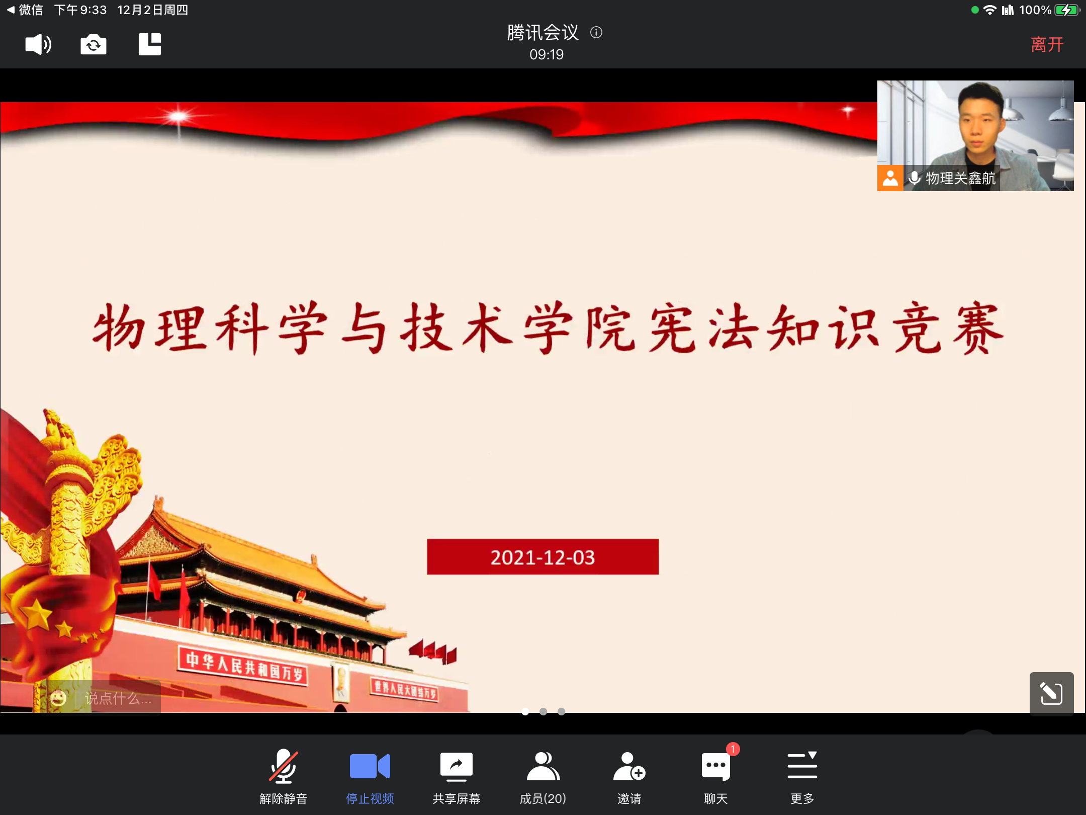 按照《关于开展“宪法宣传周”系列活动的通知 》,物理科学与技术学院在2021年12月3日开展线上宪法知识竞答活动,各年级学生干部参加。