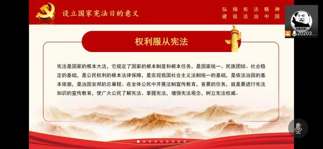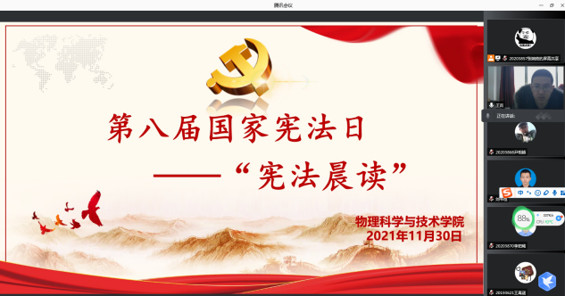 为认真学习贯彻习近平法治思想,深入贯彻落实党的十九大和十九届六中全会精神,推动我校学习宣传宪法,弘扬宪法精神,维护宪法权威。2021年12月3日上午,物理科学与技术学院组织全院学生开展线上第八届国家宪法日“宪法晨读”活动。学院团委书记王吉主持活动。