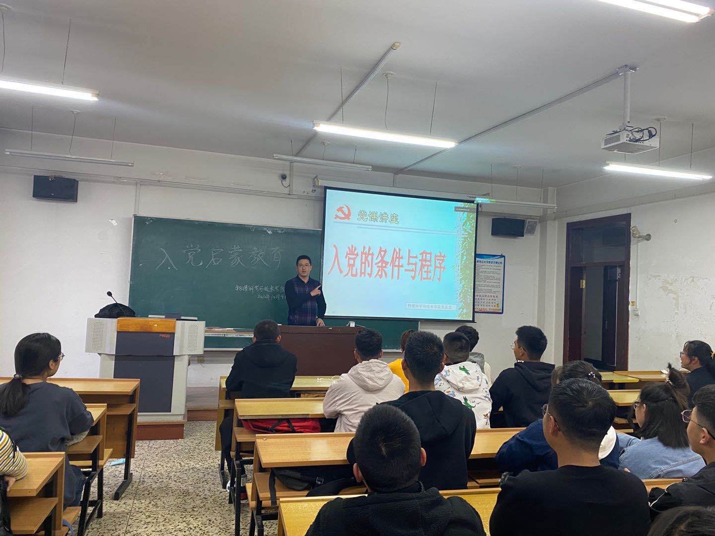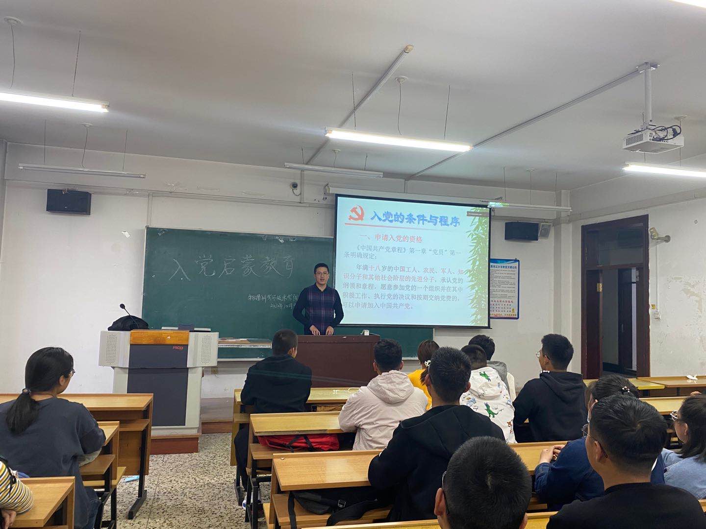 为切实做好2020级新生入学教育,增强学生对党的认识,树立正确的入党动机,了解入党流程。物理科学与技术学院于10月9日下午3点在汇文楼召开“2020级新生入党启蒙教育” 专题党课,本次党课由2020级新生辅导员王吉老师主讲。