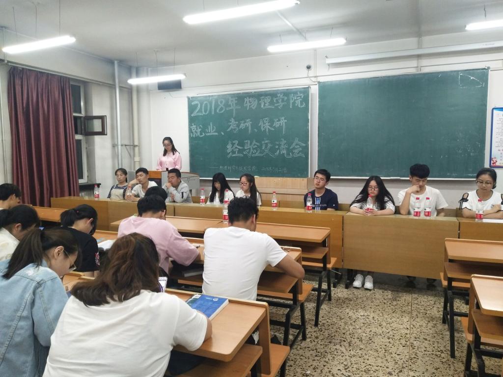 为了加强学院学风建设,为同学们提供互相沟通的渠道,物理科学与技术学院于2018年6月4日开展了2018届毕业生就业、考研、保研经验交流会,学院2016级、2017级全体学生和2018级毕业生代表出席了本次会议。会议由学院学生会学习部部长薛佼主持。