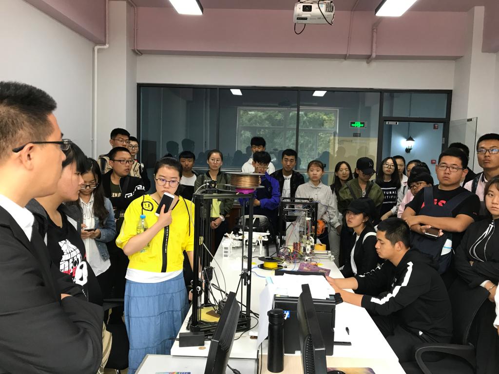随后,孵化器领导徐广昊和王拓详细介绍了各个体验区域,带领大家依次参观了孵化中心内部的就业指导区、创业培训区、实验交流区等多个具有特色区域,重点参观了3D打印设备、无人飞机等等,工作人员表示,基地内部的三台3D打印机都是由学生自己动手组装出来的,节省了许多成本,同时开拓了新的3D打印机维修市场。参观过程中,同学们对科技创新职业孵化都产生了浓厚的兴趣,有些学生当时就要求加入现在的创业团队,询问什么时候可以入孵。王老师鼓励大家有意愿就大胆尝试,激发自己更大的潜力。