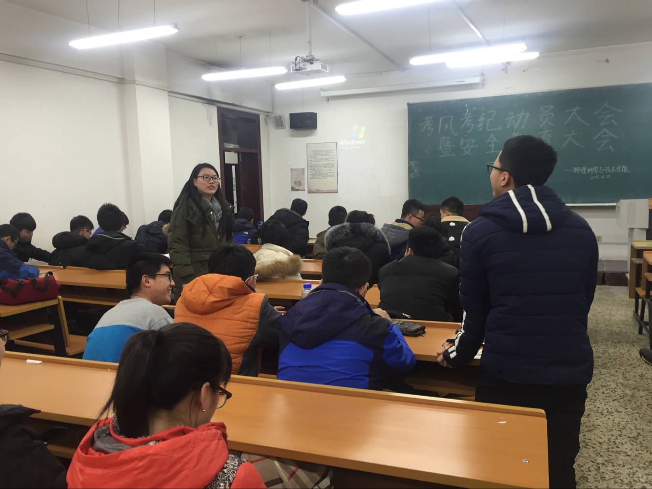 为促进学生积极备考、诚信应考,提高寒假期间自我保护意识和能力,2016年12月19日至21日,物理科学与技术学院于汇文楼304教室分别召开了各年级考风考纪动员大会暨寒假安全教育大会。参加本次会议的有院团委书记王吉老师、辅导员朱明月老师以及各年级全体学生。