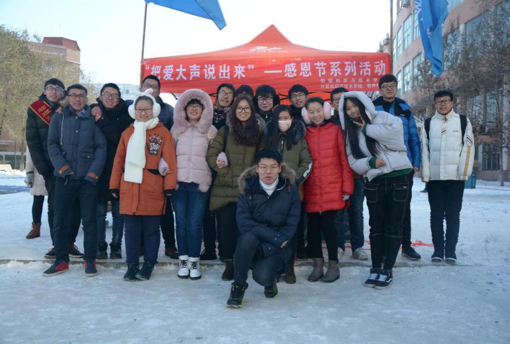 为了让在校大学生认识到感恩家人、朋友的重要性,让同学们在感恩节甚至以后每个平凡的的日子里都不忘给远方的亲人、朋友送去感谢和祝福,我院青年志愿者协会携手计算机科学软件学院青年志愿者协会于2016年11月23日星期三共同开展了大型感恩节系列活动--把爱大声说出来。参加此次感恩节活动的是我院青年志愿者协会和计算机科学软件学院青年志愿者协会的全体志愿者成员们。