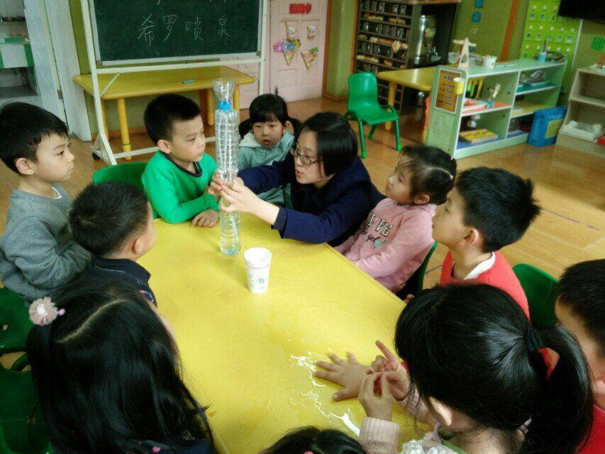 仔细地把实验器材的每一部分都介绍给小朋友们,并且介绍相关的物理原理。让小朋友们了解到气压的概念和喷泉的动力来源。
