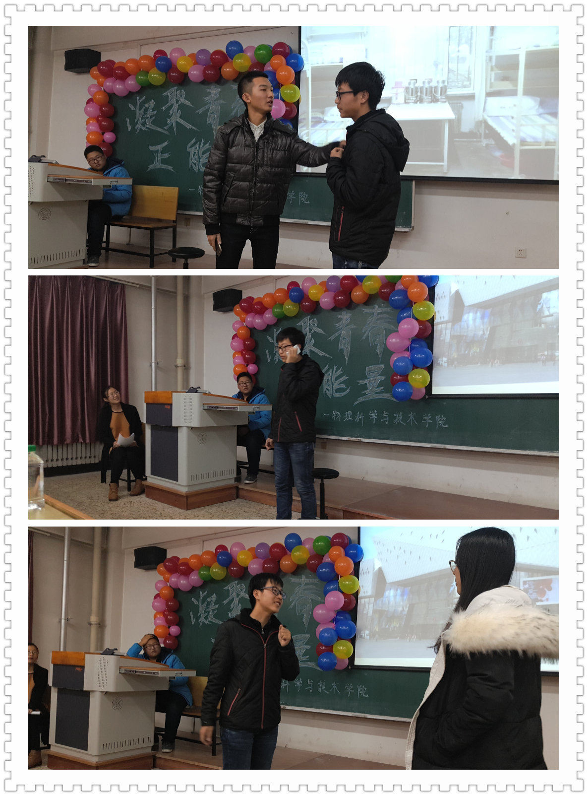 为了给物理科学与技术学院2015级新生营造一个充满青春正能量的氛围,按照学校团委要求并结合物理科学与技术学院团委工作计划,2015年11月18日16:00时,物理科学与技术学院在汇文楼405室召开以“凝聚青春正能量”为主题的团日活动。出席本次活动的有院团委书记王吉老师、班主任虞佳老师、部分学生会干部、2015级全体新生。