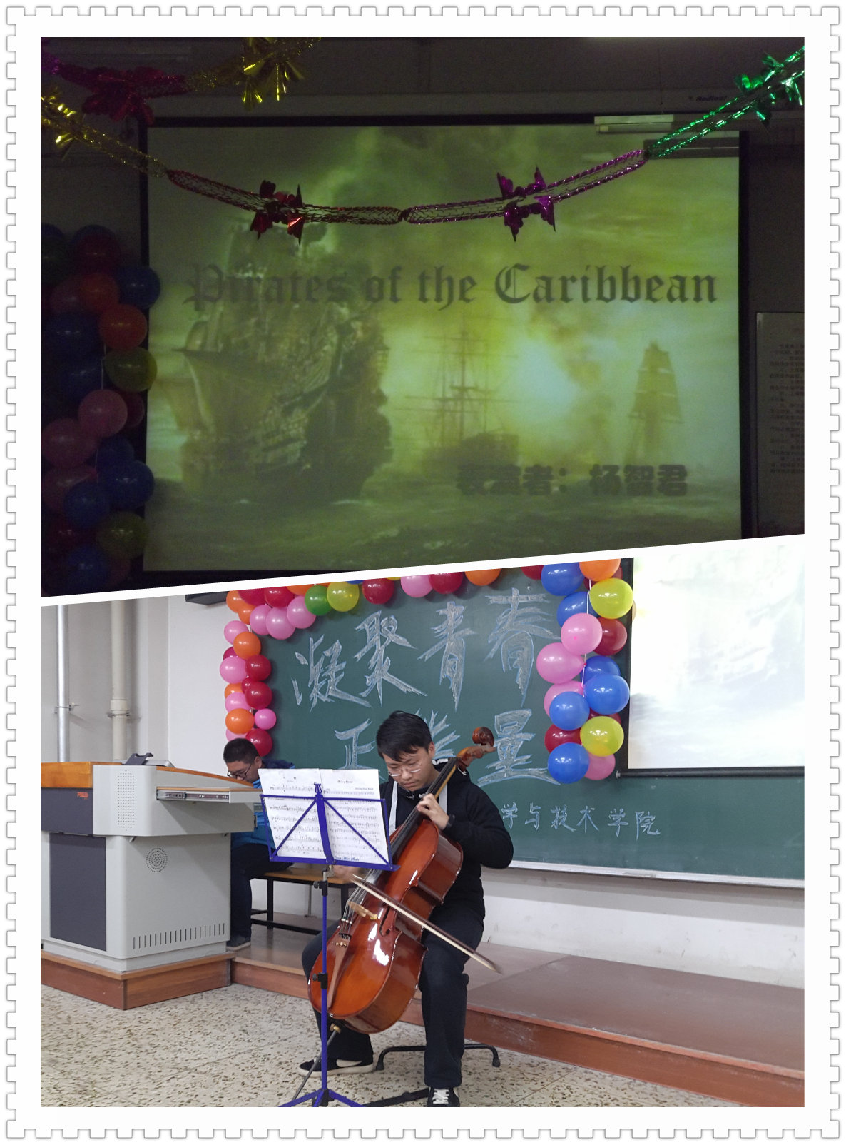 本次活动以丰富的音乐、视频为载体,以诸多充满青春气息的节目为主体,本次活动分为两个部分;第一部分为“关于这段青葱的岁月”。由马国良、张昊、张传迪、王婷婷为大家带来的诗朗诵《青春凯歌》,这首诗朗诵为大家心中青春的梦想插上了一双精神翅膀,体现了当代青年人勇于拼搏,奋发向上的理想抱负;接着张博奥同学带来的一首《微笑》教会同学们以一个乐观向上的心态去面对即将到来的生活。第二部分为“关于那些心与心之间的小事”。这部分更贴近当代学生的日常生活,细微处感悟各位同学生活中的点滴,这使大家产生共鸣。耿闯、王慧、梁湘菡、于寒啸,杨铭浩主演的小品《我要追女神》结合学生们的情感生活,将爱情这个腼腆主题戏剧化,并且深入结合当代人价值观,给予同学们很多反思。接着杨智君同学带来的大提琴独奏使在场各位同学心灵上得到净化,在欣赏音乐的同时陶冶个人的情操。随后主持人以一场“你是我的眼”的游戏活跃了现场的气氛。刘学、包龙阁演唱的《少年锦时》使大家懂得青春易逝,年华甚老,要珍惜当下的丝丝缕缕的时光。接着程启、王玉荣带来的一段相声《向左走,向右走》说出了大学生最困惑的问题——考研还是工作,实际的问题引起了同学们的深思,但风趣幽默的语言更使大家得以放松心情。最后朱垚鑫、张传迪为大家演奏的唯美的《青花瓷》。最后活动在主持人对青春的告白中圆满落幕。