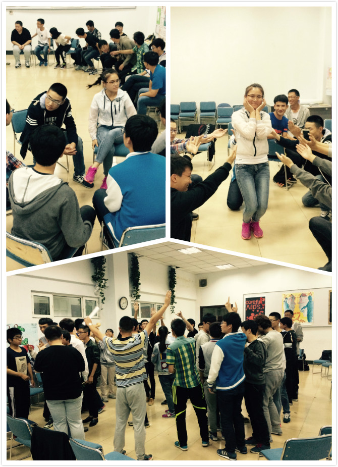 首先,王吉老师进行了3分钟的开场独白,向大家传达了此次团体活动的目的。其次,为了更快地调动气氛,使大家放松下来,进入了游戏环节——大风吹,伴随着欢声笑语,使大家真正意义上地融入在一起;紧接着为了使同学之间尽快地彼此熟悉,王吉老师让每位同学为自己设计一张“个性名片”,继而进行了“个性名片”的交流与分享;随后,根据大家出生月份、日期先后进行了“无声排队”环节,此环节考验了同学们的默契度;为进一步增进同学的相互了解,形成团体凝聚力,接下来的环节采取了分组的形势,每组六个人进行了4分钟的超级访问,大家敞开心扉,畅想未来;为了体现齐心协力、团队合作精神的重要性,本次活动加入“心有千千结”游戏环节,使同学们真正地感受到团结的力量;本次活动的最后是团队展示,每个小组独具创意的组名、口号以及亮相方式,为本次活动画上了圆满的句号。