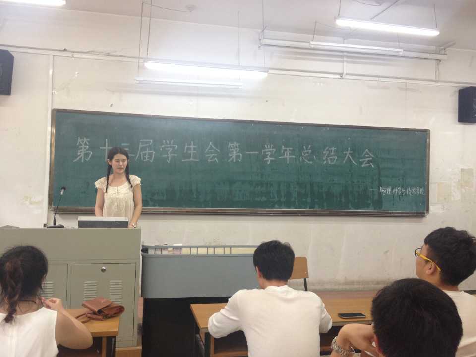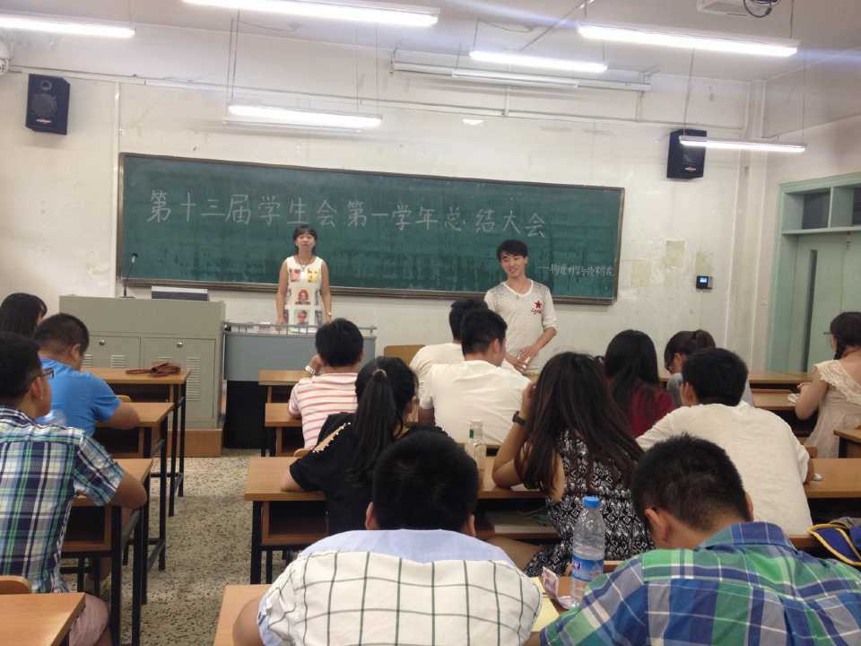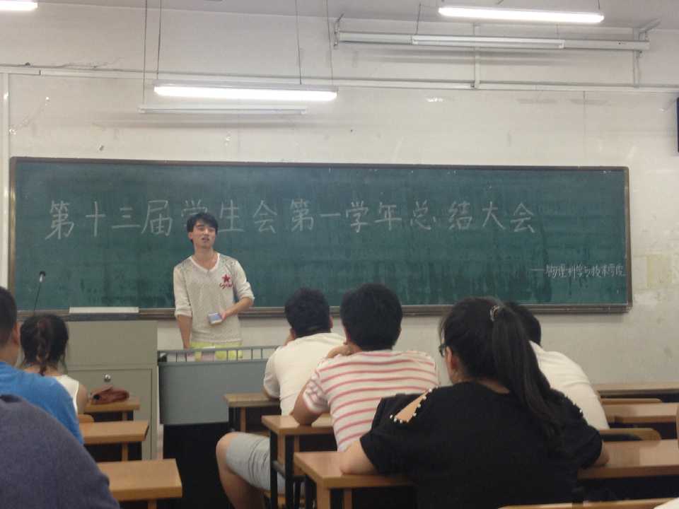 物理科学与技术学院第十三届学生会于2015年7月1日在三号楼108室召开2015年春季学期总结及秋季工作布置大会,会议由学生会主席韩琦主持,院团委书记王吉老师、院学生会副主席蔡建栋、李方剑、秘书部部长杨珍洪、学习部部长梁悦、生活部部长杨霞、体育部部长金凯龙、外联部部长房秀杰、宣传部部长韩凝、科技创新实践部部长许宏泽、院科技创新小组组长王国泰及全体各部门部员出席参加。