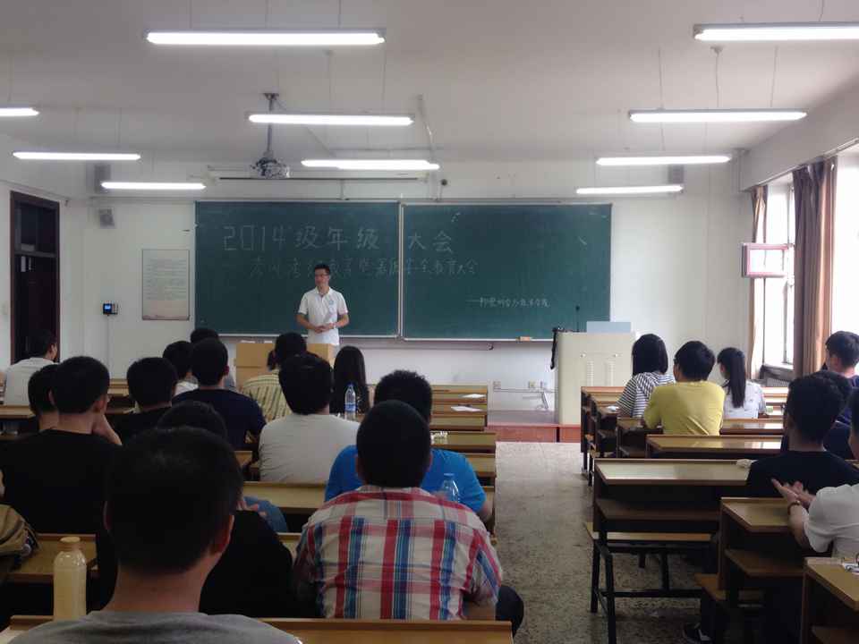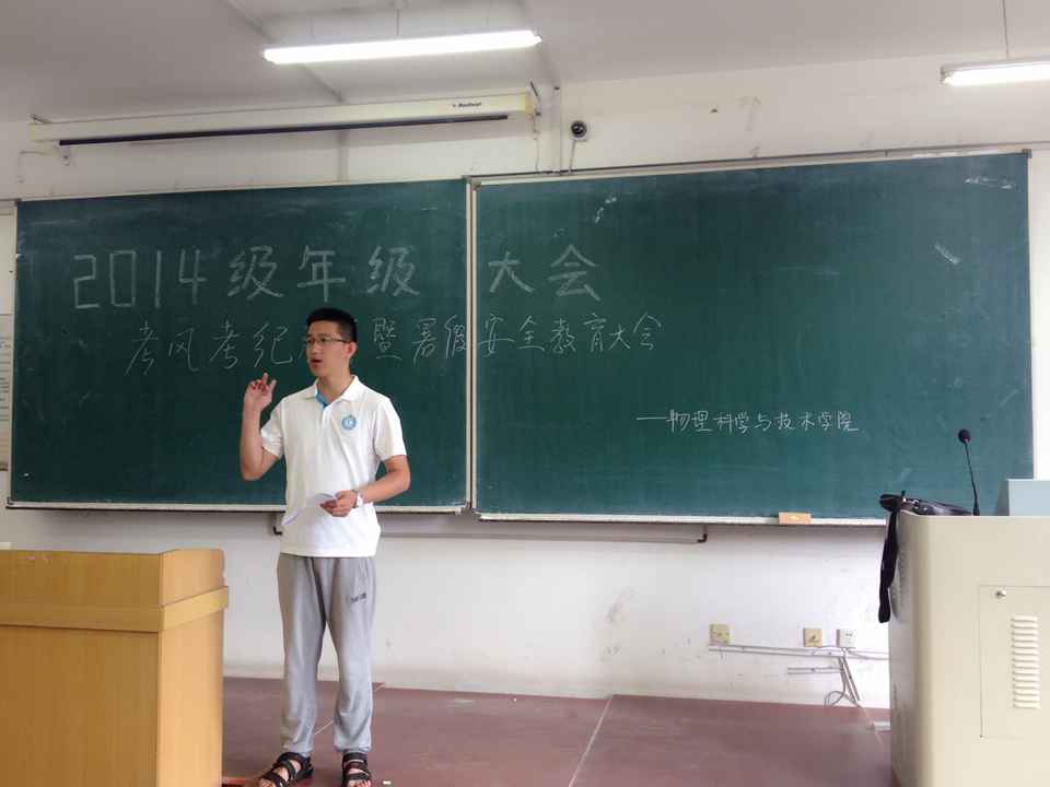 岁月如梭,期末将至。为落实我院学生期末考试工作,严肃考风考纪,提高考试质量,增强学生假期安全防范意识,让学生享受快乐假期,物理科学与技术学院于2015年6月26日下午两点在汇文楼409召开2014级年级大会,会议由院团委书记王吉老师主持,全体2014级同学参加。